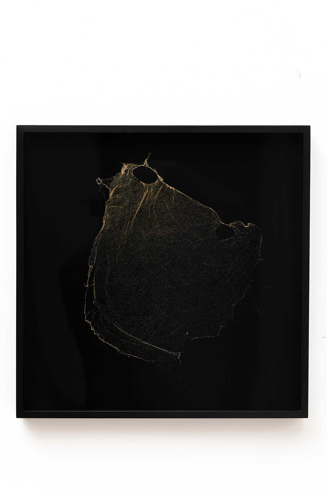 - Tomás Saraceno, TBC, 2023, tela di ragno, inchiostro d’oro, fissativo, MDF, pittura nera